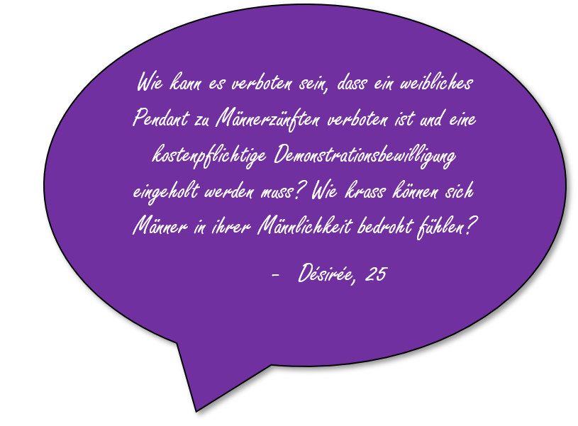 Désirée: «Ich finde das absolut lächerlich. Wie kann es verboten sein, dass ein weibliches Pendant zu Männerzünften verboten ist und eine kostenpflichtige Demonstrationsbewilligung eingeholt werden muss? Wie krass können sich Männer in ihrer Männlichkeit bedroht fühlen? Und jetzt ist es erlaubt, als Frauenzunft als Gast dabei zu sein, wie nett. Ich kann mir vorstellen, dass viele Männerzünfte immer noch ein Problem damit haben und wenn nicht, dann soll die Frau wenigstens dankbar sein, dass man als Gast jetzt mitlaufen «darf». […] Explodiert der Bögg weniger schnell oder wollen sie halt lieber «unter sich» bleiben, damit ihre geliebte Männerdynamik nicht zerstört wird und man die Stammtischparolen ohne Probleme glücklich mitgrölen kann? Ich tippe auf Letzteres.»