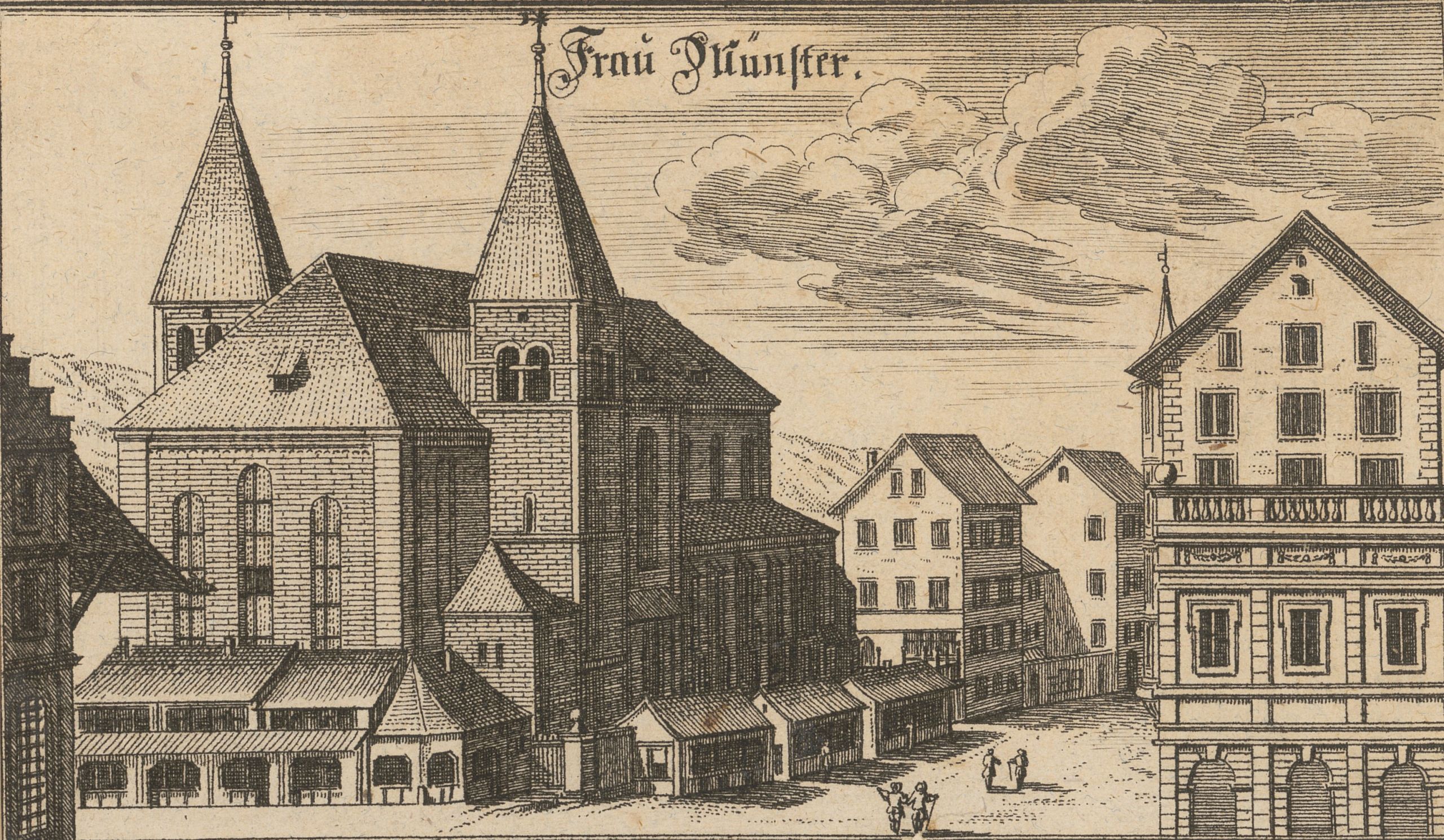Bild 18:Frau Münster. [Zürich] : [bey Heidegger und Compagnie?], [1711]. Zentralbibliothek Zürich, Zürich H1 Fraumünster I, 12, https://doi.org/10.3931/e-rara-57624 / Public Domain Mark.