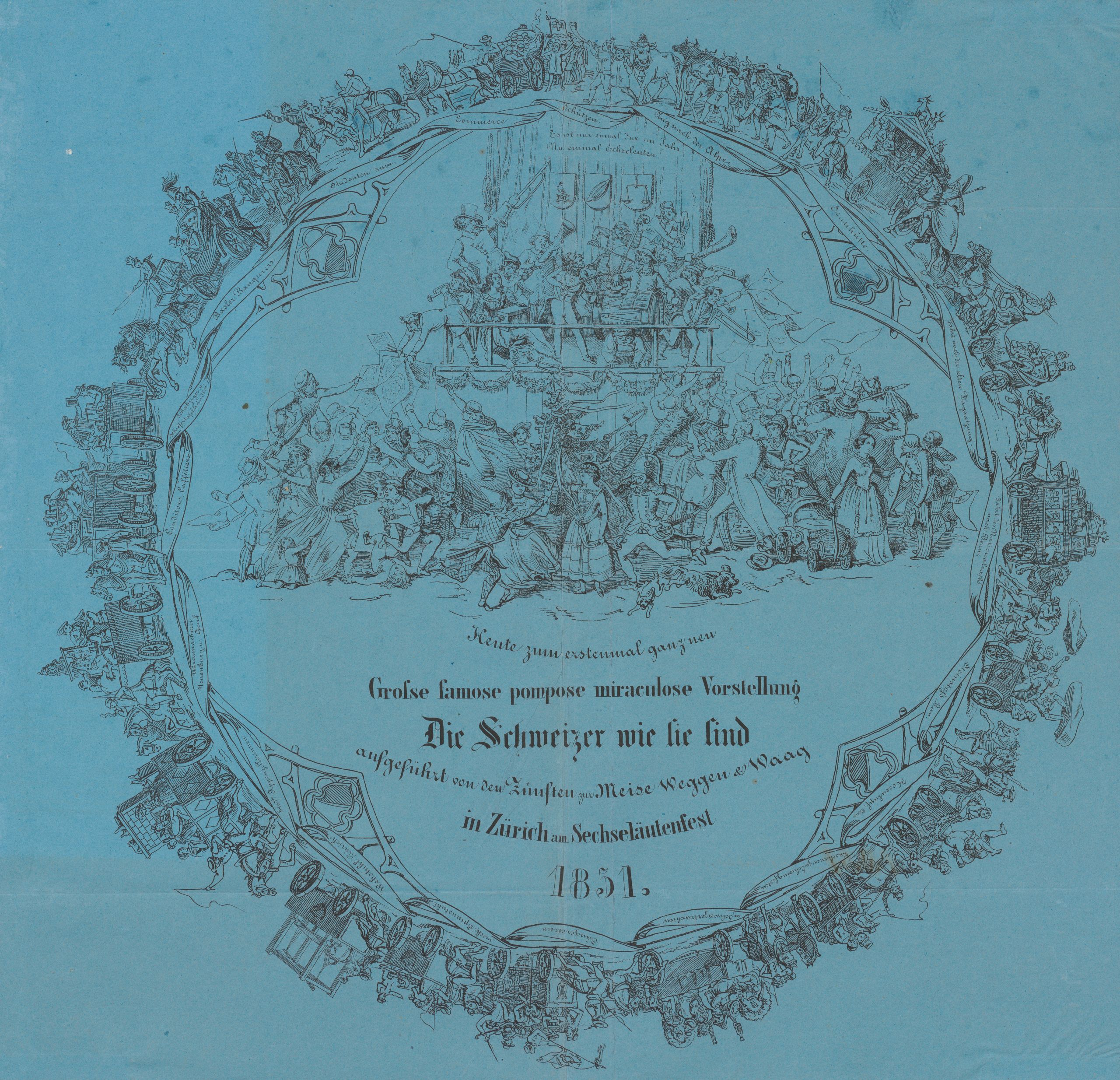 Bild 22: Die Schweizer wie sie sind : aufgeführt von den Zünften zur Meise Weggen & Waag in Zürich am Sechseläutenfest 1851. [Zürich?] : [Verlag nicht ermittelbar], 1851. Zentralbibliothek Zürich, Varia Sechseläuten III, 2, https://doi.org/10.3931/e-rara-47511 / Public Domain Mark.